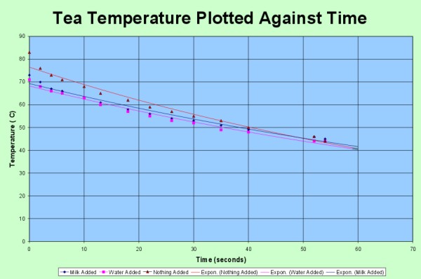 The ExperimentThe video shows how I set about testing out which of the hypotheses was most likely.I made my tea in measuring jugs rather than cups so I could ensure that there was the same amount of tea in each one (700ml after removing tea bags). I checked that all three jugs were the same temperature at the start of the experiment (83ºC). I used three jugs so that I could compare the effects of adding 100ml cold water at 12ºC with 100ml cold milk at 12ºC and 100ml milk that had warmed. By using cold water as well as milk I hoped to discover whether the lipid content of the milk had an effect. I noted the time, added the cold milk and water to their respective jugs and then, every minute or so I stirred the jugs and measured the temperature. The ResultsThe graph below says it all really. You can download the numbers as a spreadsheet in Microsoft Excel format if you'd like to repeat the experiment and add your own results. |